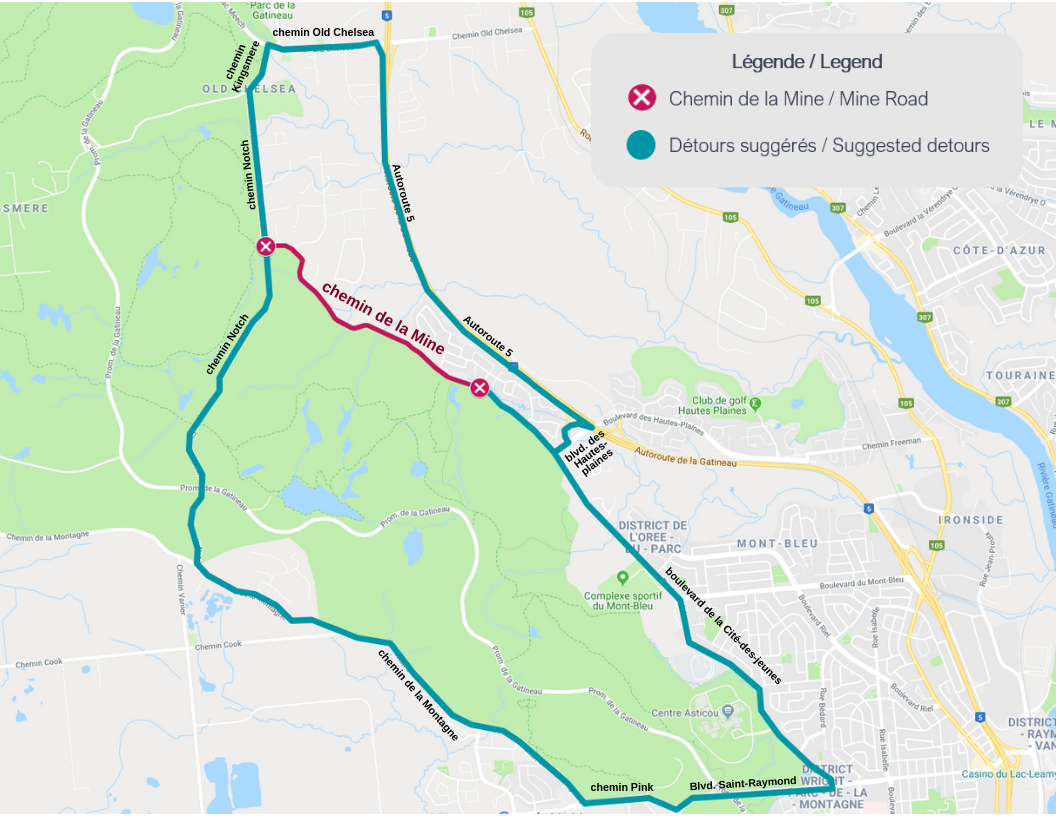 The Municipality of Chelsea wishes to inform its residents that due to rehabilitation work, Chemin de la Mine will be closed to traffic north of the intersection of Rue Marie-Burger on Monday, July 13 between 9:00 a.m. and 7:00 p.m.