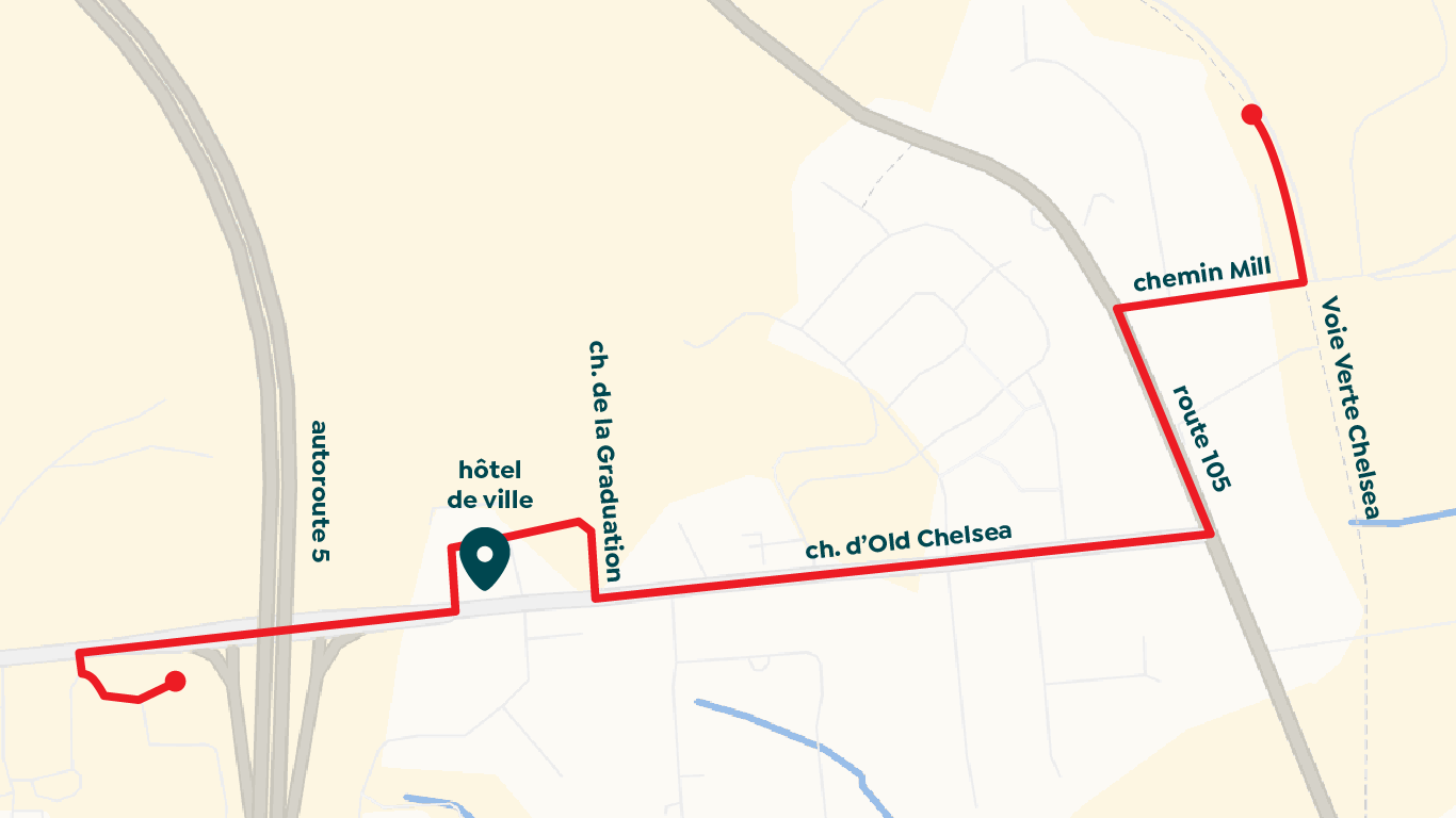 Afin de contourner le rond-point sur le chemin d’Old Chelsea, une partie du déplacement de l’édifice patrimonial se fera à travers les stationnements situés à l’ouest et au nord de l’hôtel de ville, ensuite derrière le terrain de baseball, puis par le chemin de la Graduation, avant de rejoindre à nouveau le chemin d’Old Chelsea.